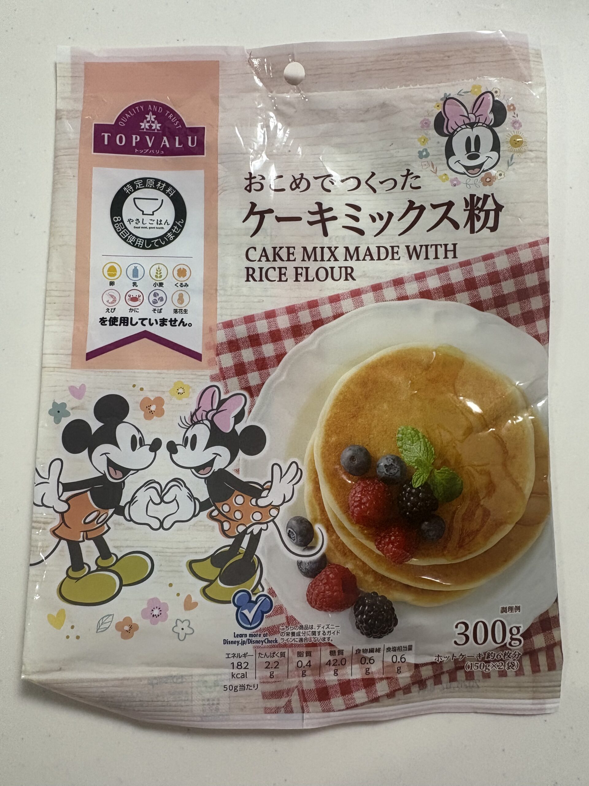 朝食やおやつの時に使うのがイオントップバリュの『おこめで作ったケーキミックス粉』です。(特定原材料8品目不使用)