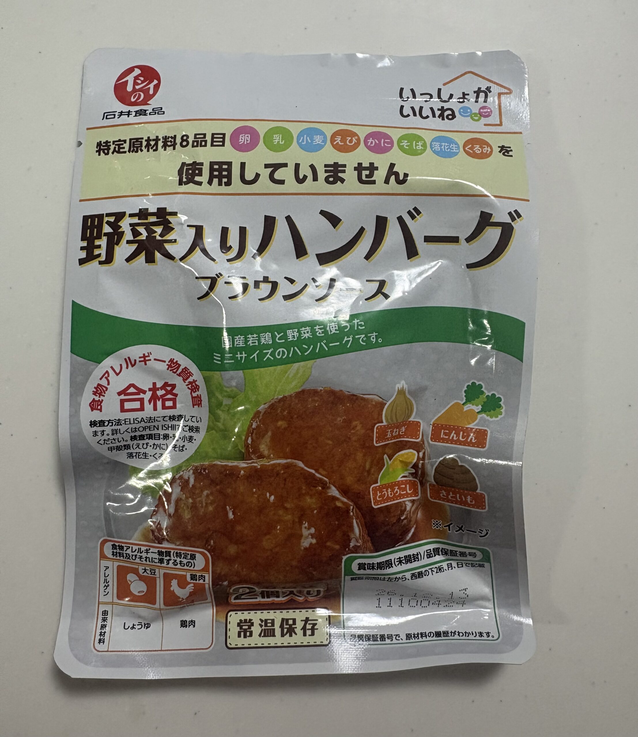 もう一品何か欲しい時やお弁当を作った時に使うのが石井食品の『野菜入りハンバーグ ブラウンソース』です。(特定原材料8品目不使用)
